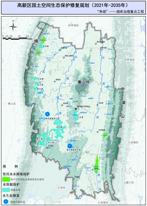 山:“两山一坪”,是重要生态屏障和城市绿心。高新区地形由窄条状山脉和宽缓的丘陵台地组成,呈东西高、中部凸起、河谷沿线低的总体特征。缙云山、中梁山自西向东分布,纵贯南北,在区内分别呈“一山一岭”“一山两岭一槽”地貌,海拔500米—700米,相对高差约300米—500米,物种多样性丰富,森林覆盖率高,是中心城区重要的生态屏障。寨山坪平地起高台,为城市一级山体,相对高差230余米,山势绵延起伏,植被茂盛,是重要的城市绿心。