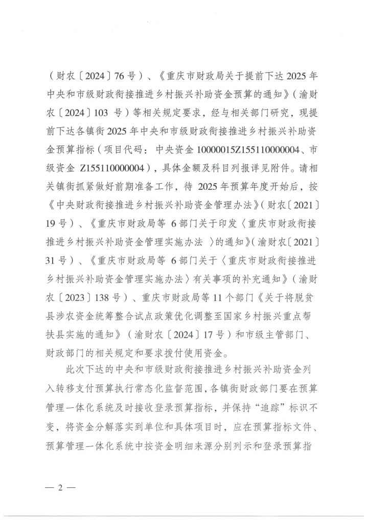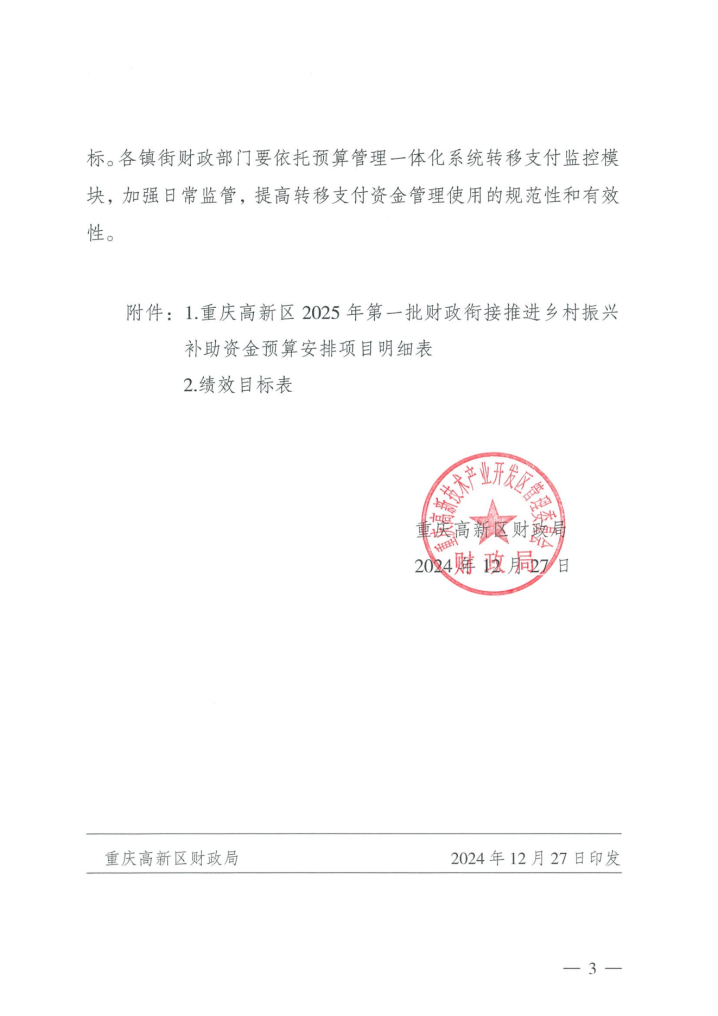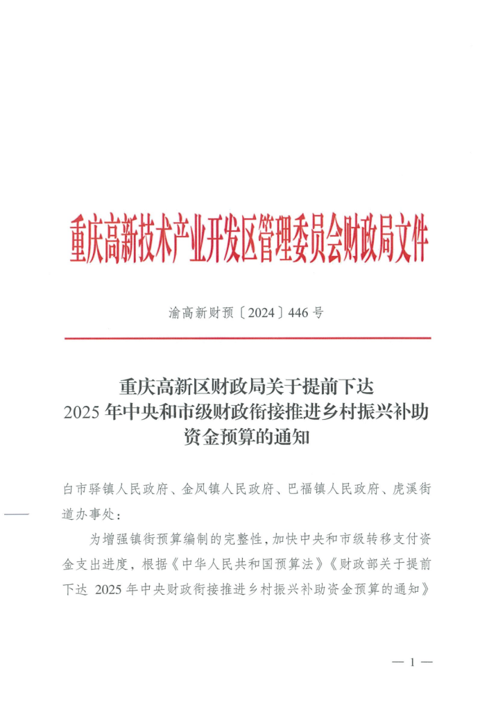 根据中共重庆市委农村工作暨实施乡村振兴战略领导小组办公室《关于加强财政衔接推进乡村振兴补助资金项目公告公示的通知》(渝委农办〔2021〕31号)文件要求,现将伟徳1946财政局《关于提前下达2025年中央和市级财政衔接推进乡村振兴补助资金预算的通知》(渝高新财预〔2024〕446号)予以公示。