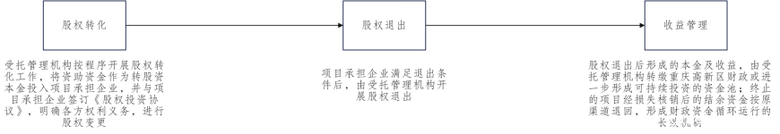 经工作组审议通过后,受托管理机构按照相关法律规定,通过企业回购、股权转让、减资、清算等方式实施项目股权退出,具体退出方式根据与项目承担企业《股权投资协议》约定的为准。 |